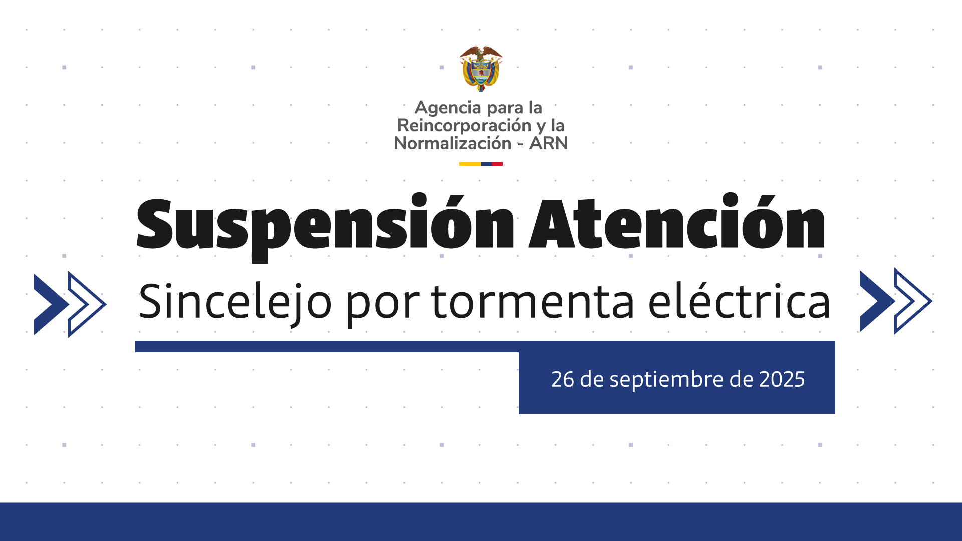 ARN informa a la ciudadanía que, en el Grupo territorial ARN Sucre Bolívar Córdoba, sede Sincelejo, ubicado en la calle 13a N° 20-62, barrio La Ford, no habrá atención al público hoy 26 de septiembre debido a la